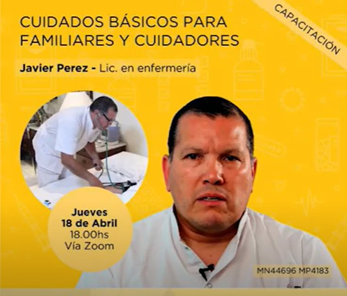 Cuidados básicos para familiares y cuidadores. 08/05/2024 Capacitamos a cuidadores: enfermeros y domiciliarios. Como parte de nuestro programa de atención a la comunidad ELA, realizamos una nueva capacitación con el Lic. Javier Pérez, un experto en la materia.