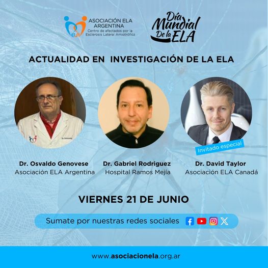 Actualidad en investigación de la ELA 04/06/2024 En ocasión del Día Mundial de la ELA, el viernes 21 de junio compartiremos un conversatorio entre médicos neurólogos con la participación especial del Dr. David Taylor, vicepresidente de investigación y asociaciones estratégicas de la ALS Canada.