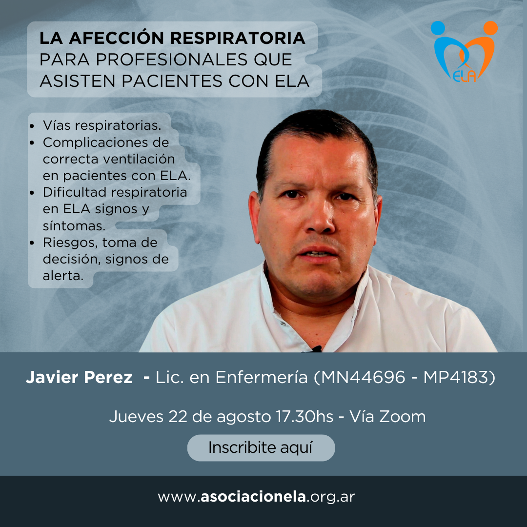 La importancia de la asistencia respoiratoria 20/08/2024 Para profesionales enfermeros y cuidadores que asisten a pacientes con ELA. Será dictada por el Lic. Javier Pérez en modo virtual el próximo jueves 22 de agosto a las 17.30 hs. Interesados deberán inscribirse aquí: rb.gy/ecrhof