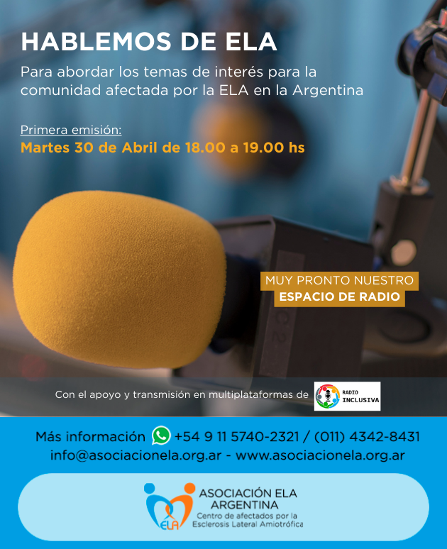 Hablemos de ELA 05/04/2024 El martes 30 de abril inauguraremos un espacio radial para abordar - en emisiones mensuales- los temas de interés que atañen a la comunidad de afectados por la ELA en nuestro país. Será emitido por Radio Inclusiva en multiplataformas on line.